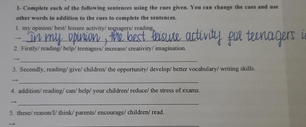 I- Complete each of the following sentences using the cues given. You can change the cues and use