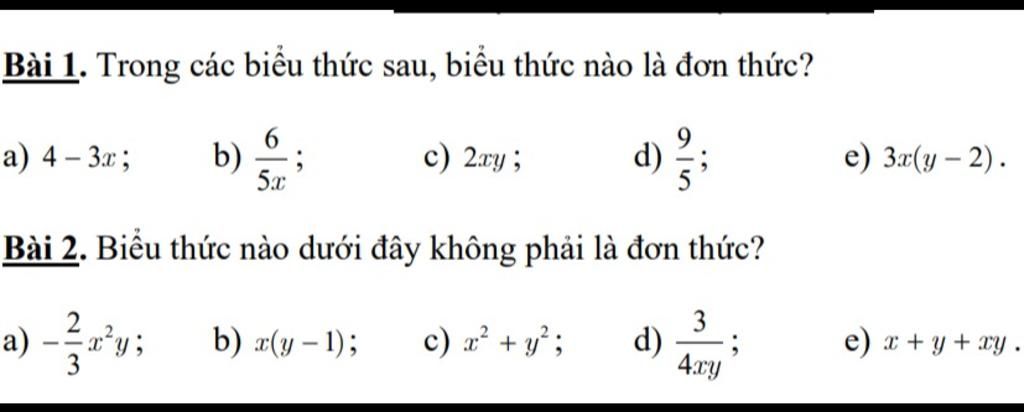 Bài 2: Không phải đơn thức: b,c,e