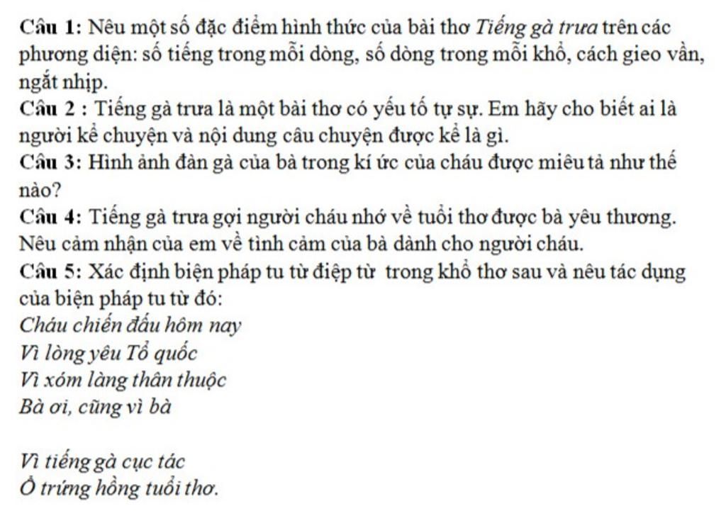 Câu 1: Nêu một số đặc điểm hình thức của bài thơ Tiếng gà trưa trên các