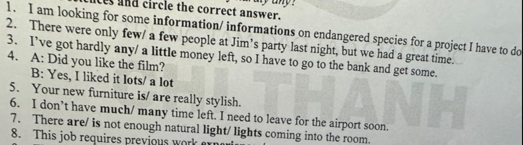 7. is / light (light là danh từ ko đếm được nên ta dùng động từ tobe is)
