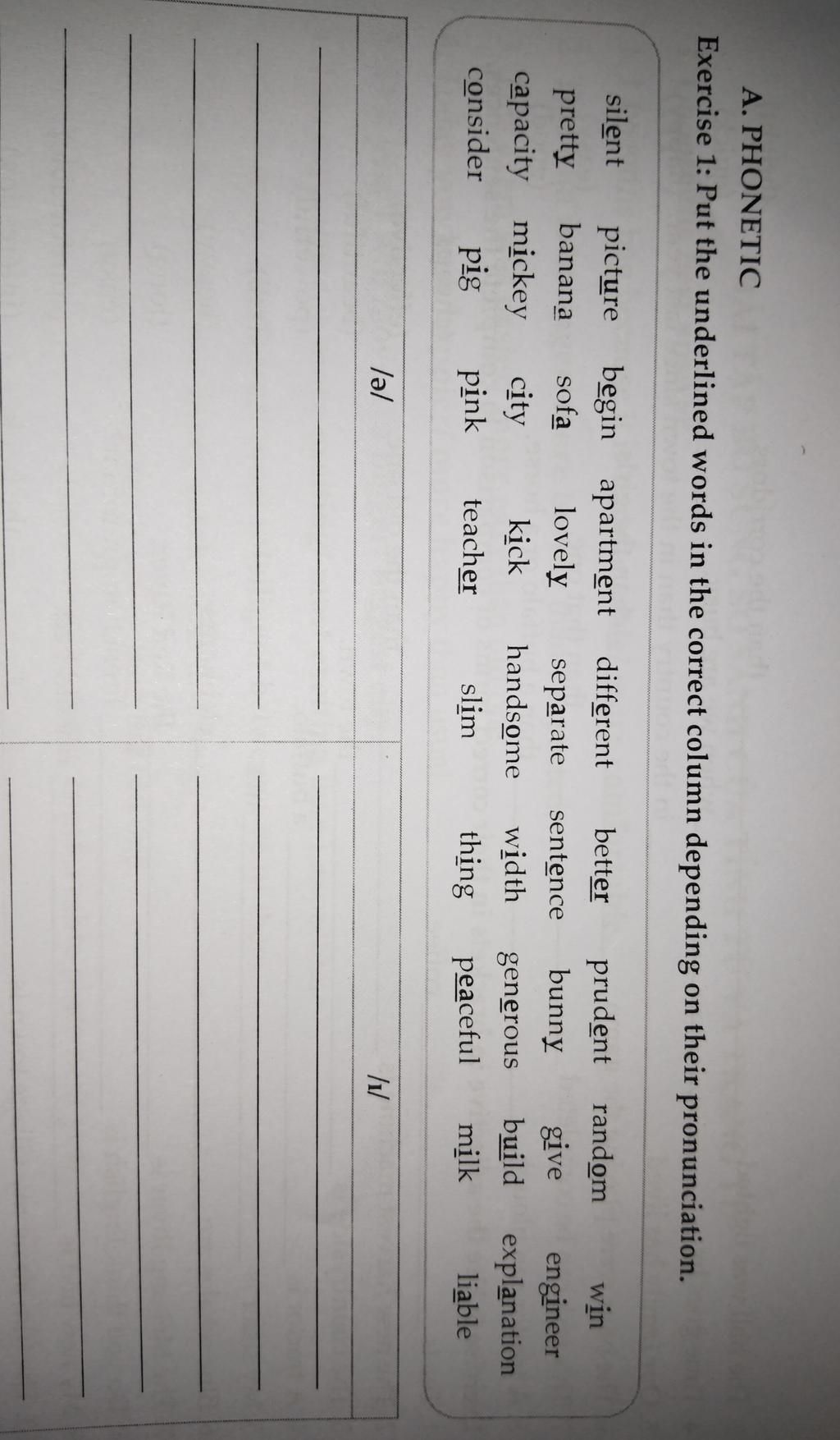 Những từ phát âm là /ə/: silent, picture, apartment, better, random, banana, sofa, separate, sentence, capacity, handsome, generous, explanation, consider, teacher, liable, different, prudent.