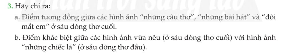 b. Điểm khác biệt giữa các hình ảnh vừa nêu (ở sáu dòng thơ cuối) với hình ảnh “những chiếc lá” (ở sáu dòng thơ đầu).
