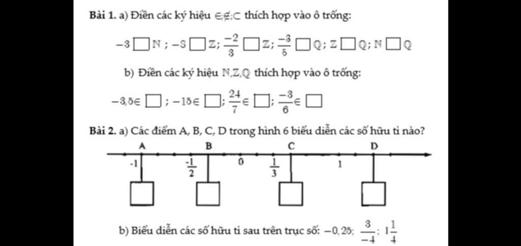 `frac{-3}{6}` `∈` `Q` `(` Vì `N` và `Z` là tập hợp số tự nhiên và số nguyên mà `frac{-3}{6}` là số thập phân nên `frac{-3}{6}` `∉` `N` `,` `Z` `)`