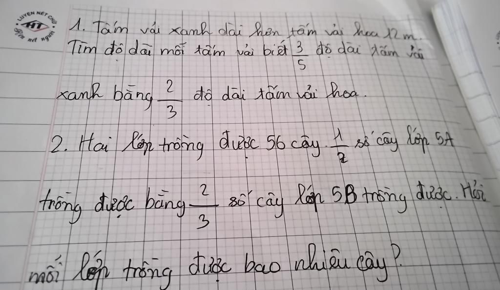 $\frac{1}{2}$ số cây lớp 5A trồng được bằng $\frac{2}{3}$ số cây lớp 5B