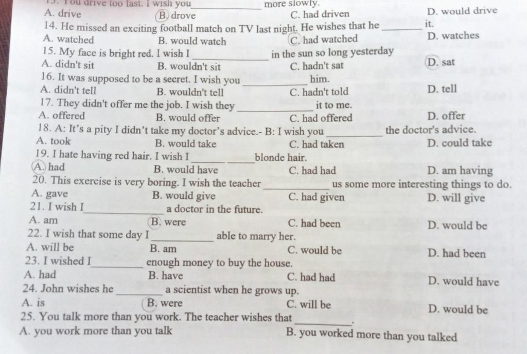 19. A (Tôi ghét có một mái tóc màu đỏ. Tôi ước tôi có một mái tóc màu vàng -> câu ước hiện tại)