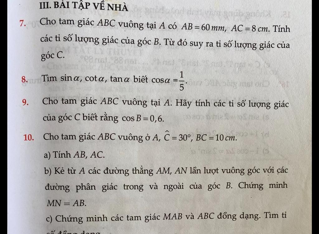 7. Cho tam giác ABC vuông tại A có AB=60mm, AC=8 cm. Tính