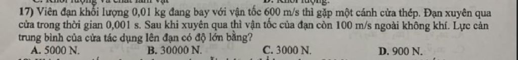 \(F = ma = 0,01.\left( { - 500000} \right) = - 5000\left( N \right)\)
