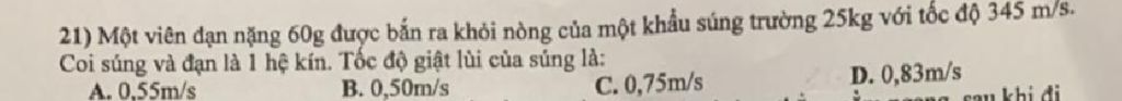 Vậy tốc độ giật lùi của súng là: \(0,828\left( {m/s} \right)\)