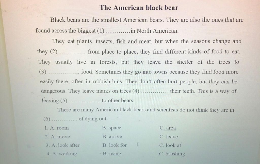3. B (tìm kiếm) tạm dịch: chúng thường sống trong rừng, nhưng chúng rời nơi trú ẩn ở cây để tìm kiếm thức ăn.