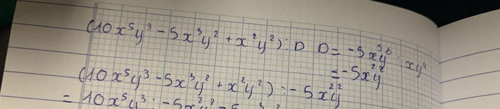 `= 10x^5 y^3 : (-5x^2 y^2) - 5x^3 y^2 : (-5x^2 y^2) + x^2 y^2 : (-5x^2 y^2)`