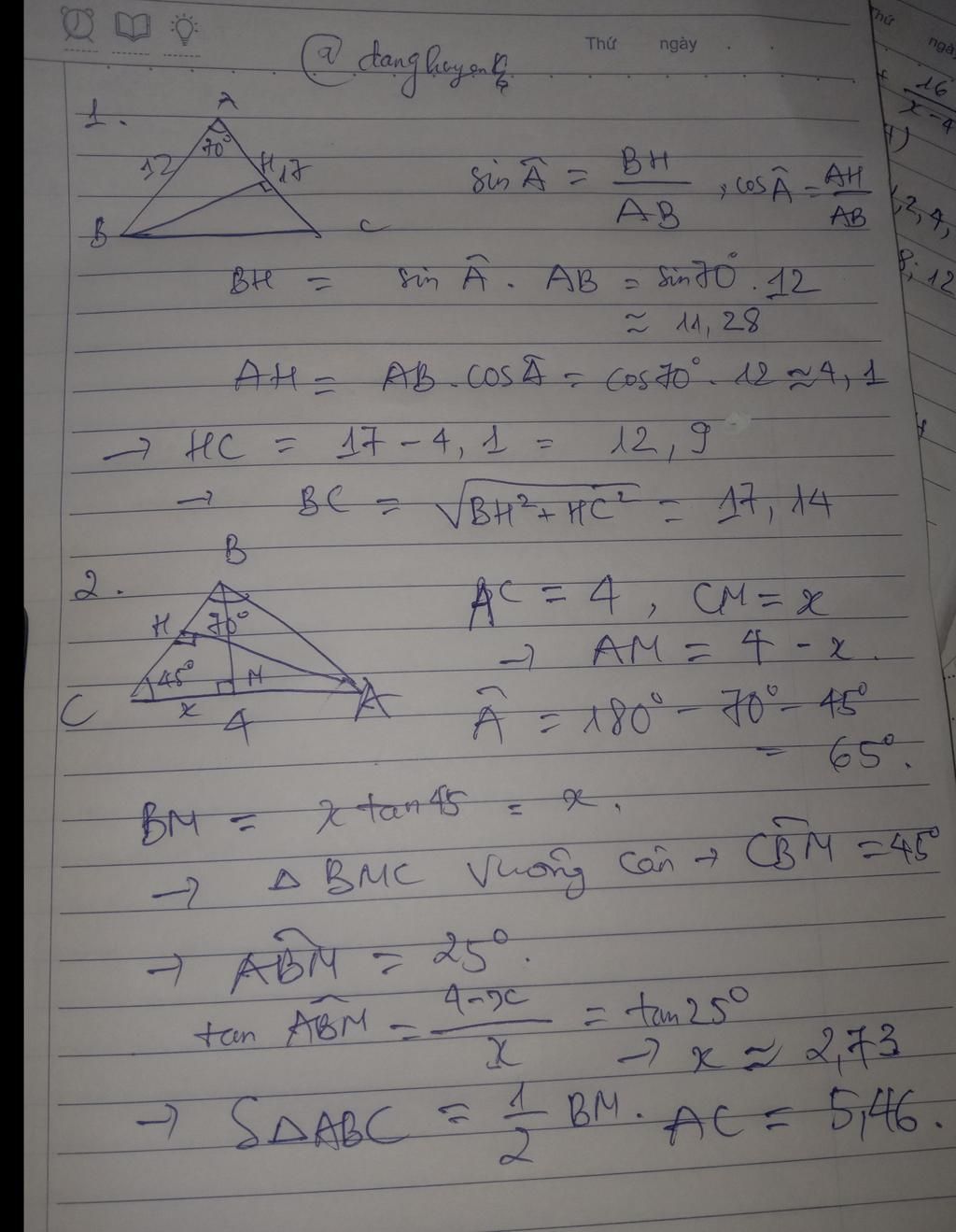 Cho tam giác ABC có góc A=70°,AB=12cm AC=17cm tính độ dài đoạn BC