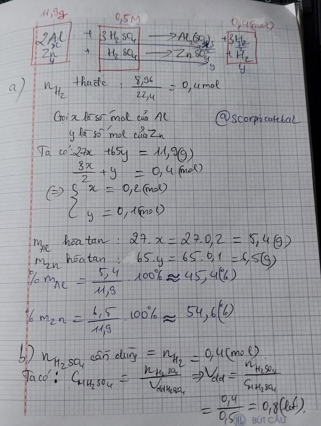 Gọi `x,y` lần lượt là `n_(Al),n_(Zn)`