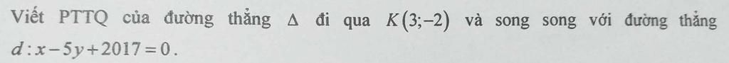 `=>` `(Delta): \ x-5y+c=0` `(c ne 2017)`