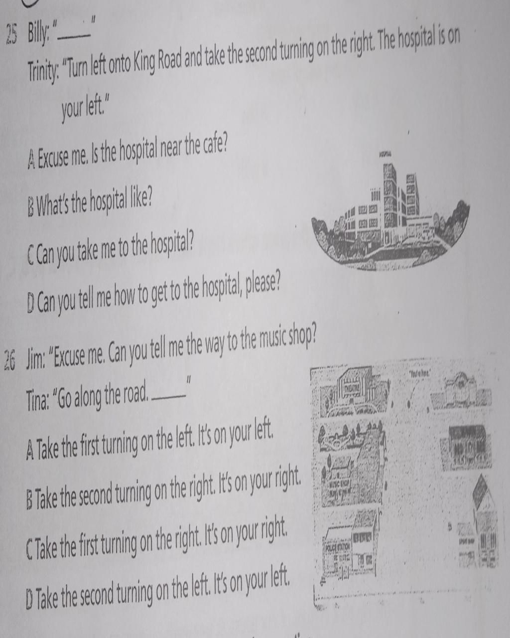 `+` Vì phần trả lời là chỉ đường để đến được bệnh viện mà không không phù hợp với các ý A, B, C.