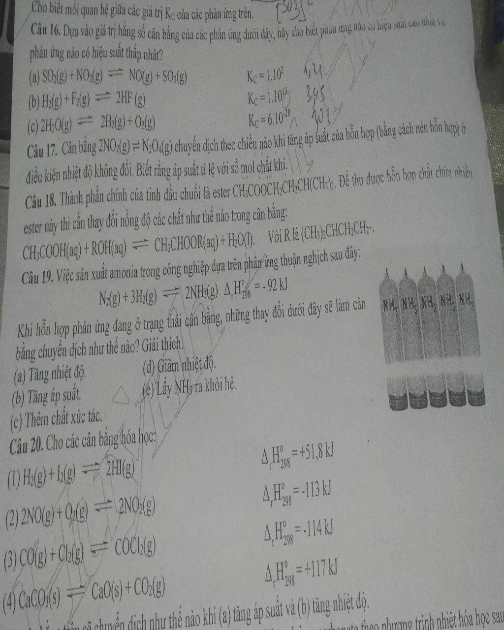 $(e)$ Chiều thuận vì để thiết lập lại cân bằng thì hệ sẽ làm $N_2$ phản ứng với $H_2$ tạo ra lại lượng $NH_3$ bị lấy ra.