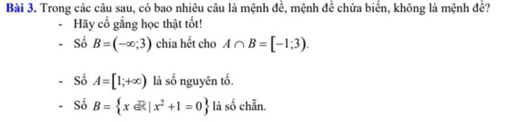 `-` Số `B={x in RR|x^2+1=0}` là số chẵn là một mệnh đề chứa biến `(x)`