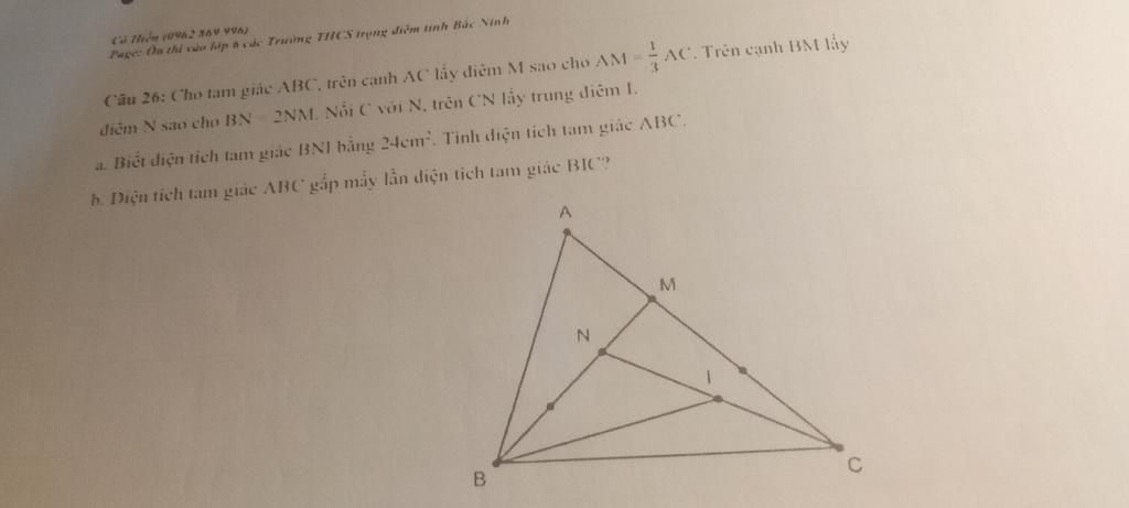 Smnc=1/3 Smbc(vì chung chiều cao hạ từ đỉnh c và đáy mn=1/3 đáy nb)
