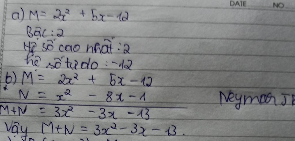 a.Bậc của $M$ là $2,$ hệ số cao nhất là $2,$ hệ số tự do là $-12$