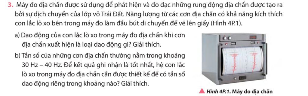b) Hệ con lắc lò xo trong máy đo địa chấn cần được thiết kế có tần số dao động riêng cũng nằm trong khoảng 30 Hz – 40 Hz để những tín hiệu ghi nhận được có biên độ lớn, dễ dàng cho chúng ta trong việc quan sát và xử lí tín hiệu.