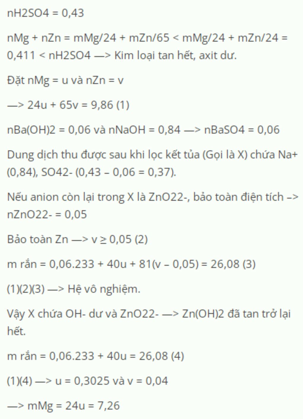 Cho 9,86 gam hỗn hợp gồm Mg và Zn vào một cốc chứa 430 ml H2SO4, dung dịch 1M (loãng), Sau khi các pư hoàn toàn, thêm tiếp vào các 1 lít dung dịch Ba(OH)2 0,48M khuấy đều cho các phản ứng xảy ra hoàn toàn, lọc kết tủa và nung đến khối lượng không đổi thì thu được 112,279 gam chất rắn