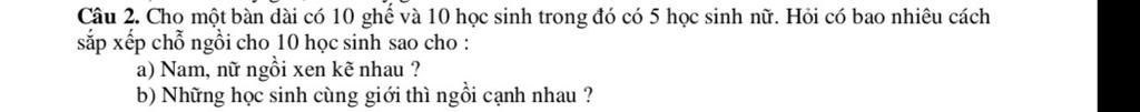 ⇒ Có 28800 cách xếp 10 hs cùng giới ngồi cạnh nhau