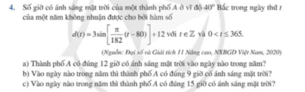 4. Số giờ có ánh sáng mặt trời của một thành phố A ở vĩ độ 40° Bắc trong ngày thứ t của một năm không nhuận được cho bởi hàm số