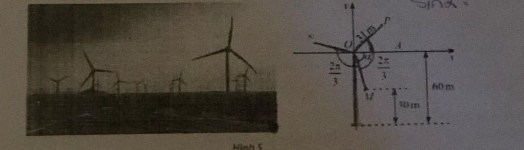 Trong Hình 5, ba điểm M,N,P năm ở đầu các cánh quạt của tua-bin gió. Biết các cảnh quạt dài 31m, độ cao của điểm M so với mặt đất là 30m, góc giữa các cánh quạt là 2pi/3 và số đo góc (OA,OM) là a