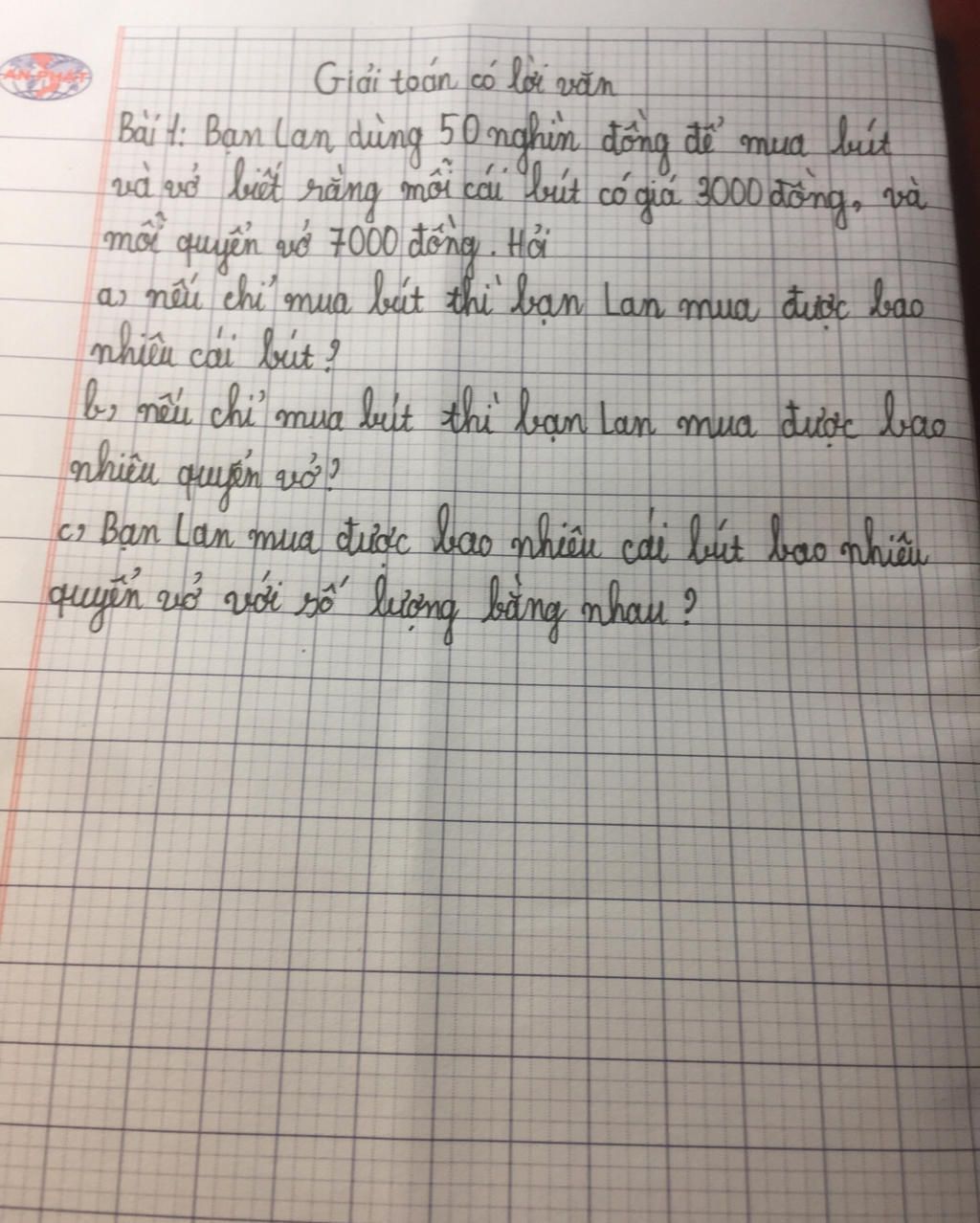 b) Nếu chỉ mua vở thì bạn Lan mua được số vở là:. 50 000 : 7 000 = 7,1 = 7 quyển vở