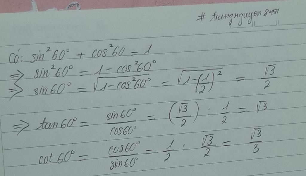 Vậy `sin60^o=(\sqrt3)/2;tan60^o=\sqrt3;cot60^o=(\sqrt3)/3`