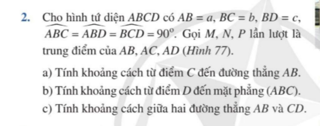 2. Cho hình tứ diện ABCD có AB = a, BC = b, BD = c, ABC = ABD = BCD =90°. Gọi M, N, P lần lượt là