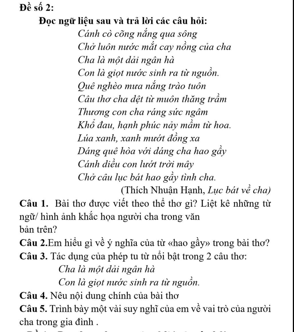 $\textit{Câu 4:}$ Tình cảm của người con dành cho cha được thể hiện sâu sắc qua những ánh thơ độc đáo, xúc động kia. Trong bài thơ, người con miêu tả thân hình gầy gò, hao mòn theo ngày tháng của người cha nhưng vẫn làm lụng vất vả và chịu đựng. Cha là một tấm gương sáng, luôn động viên và thầm lặng hành động, cử chỉ với con. Tình cảm phụ tử của người con dành cho cha và người cha dành cho con là một sự vô giá.