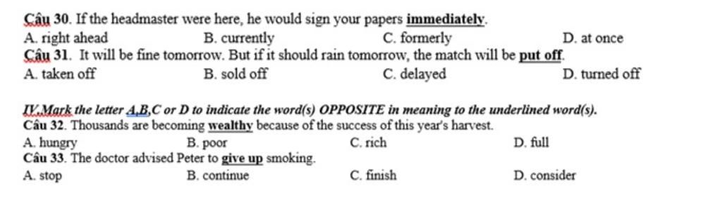 30. immediately là ngay lập tức thì at once là cùng một lúc, lập tức