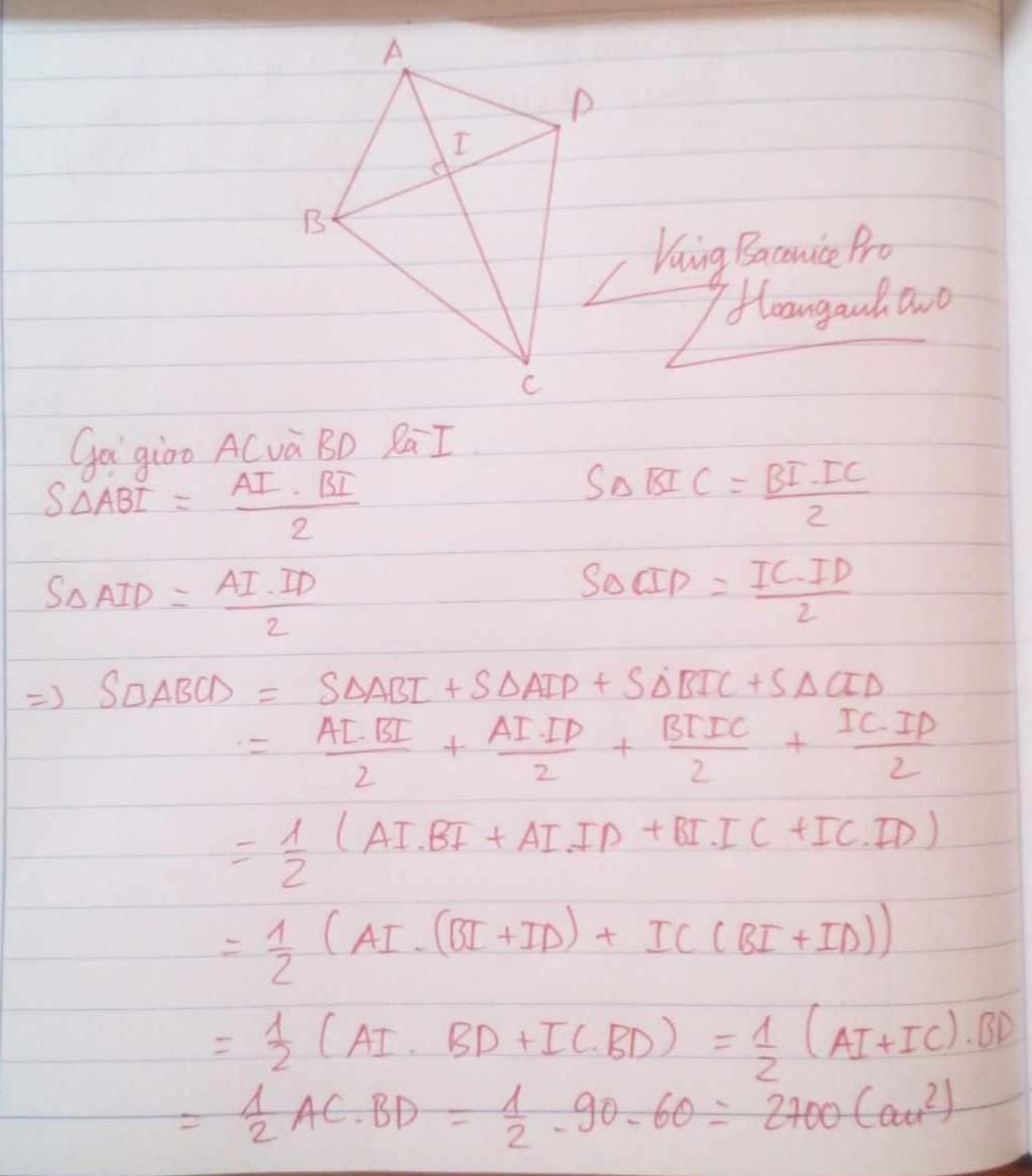 Ta có: `S_(ABCD)=S_(ABD)+S_(BCD)=1/2AI.BD+1/2CI.BD=1/2BD(AI+CI)=1/2BD.AC=1/2 .90.60=2700(cm^2)`