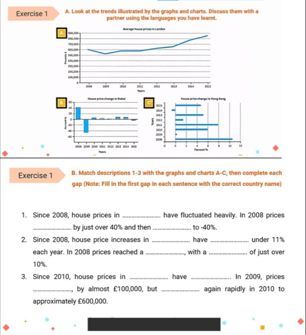 B. Match descriptions 1-3 with the graphs and charts A-C, then complete each