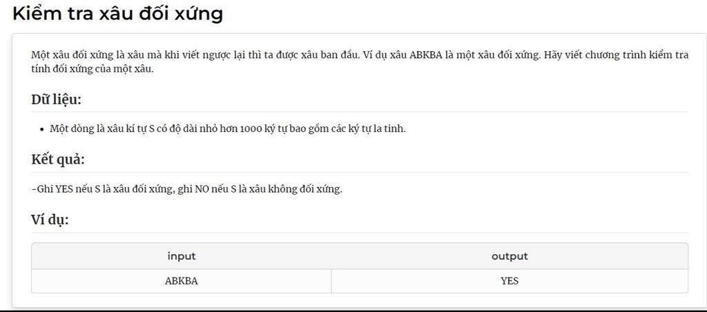 Đầu tiên đặt một biến d là độ dài của xâu s; sau đó nếu `s_i` khác `s_d-i-1` (vì d-1 là ký tự cuối của xâu) thì in ra NO và dừng lại, còn không thì in ra YES và dừng lại.