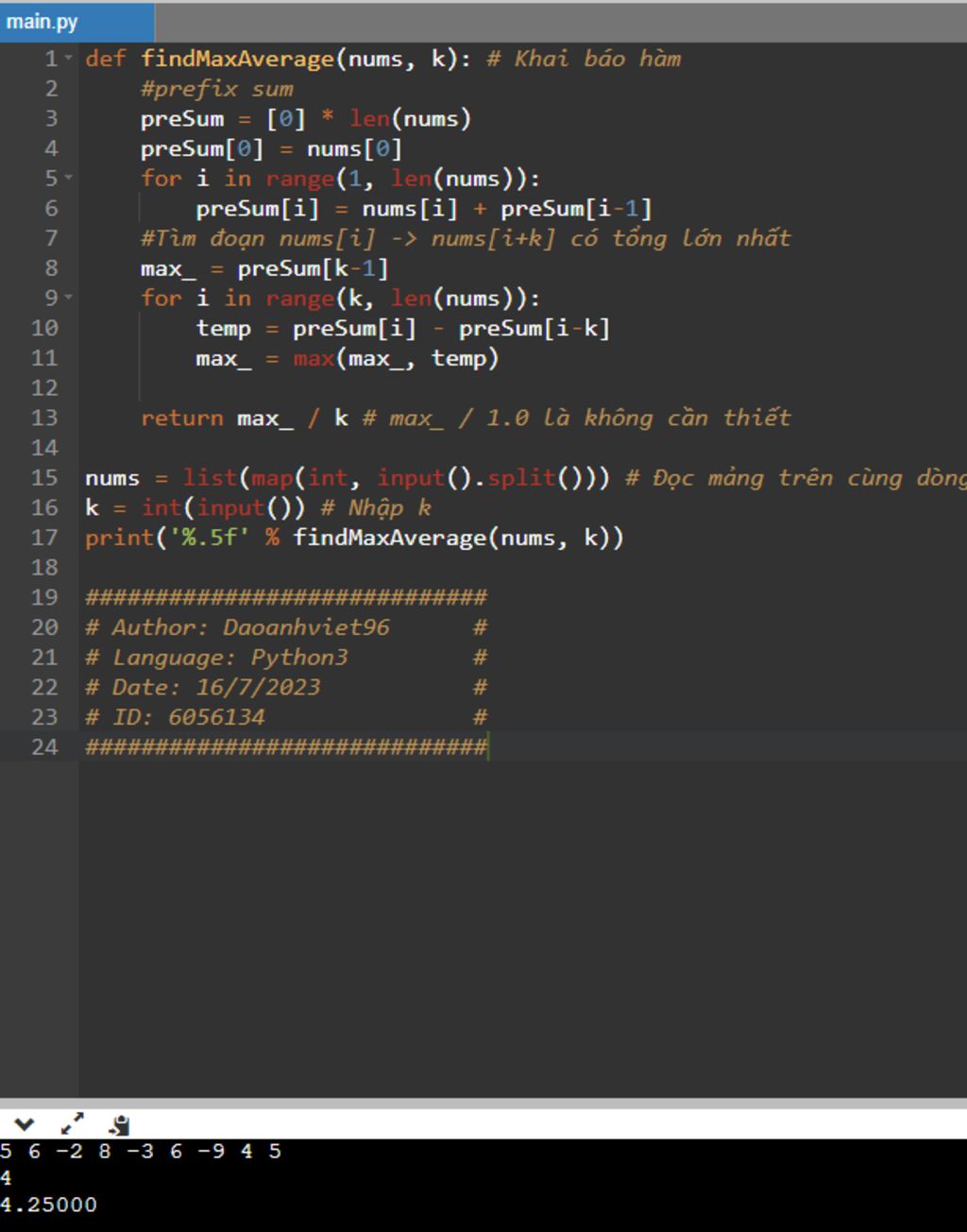 def findMaxAverage(nums, k): # Khai báo hàm