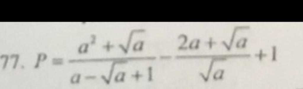 ` 77 . P = (a^2+sqrt{a})/(a-sqrt{a}+1) - (2a+sqrt{a})/sqrt{a} + 1 `