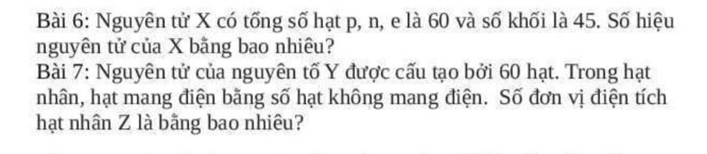 $\rm 6)\\Ta Có:\\2p+n=60\\p+n=45\\\xrightarrow[]{}\\p=e=15(hạt)\\n=30(hạt)\\\xrightarrow[]{}\text{Số hiệu nguyên tử là 15}\\7)\\Ta Có:\\2p+n=60\\p=n\\\xrightarrow[]{}p=e=n=20(hạt)\\\xrightarrow[]{}Z=20+$