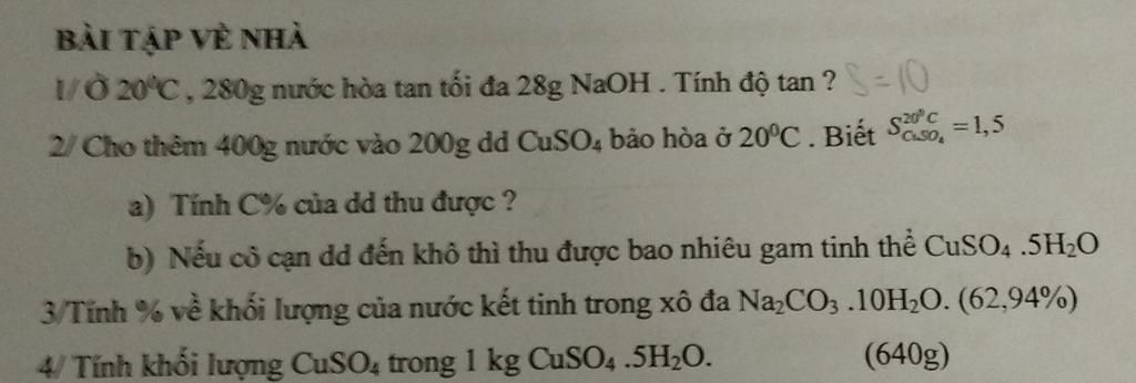 2/ Cho thêm 400g nước vào 200g dd CuSO, bảo hòa ở 20C . Biết S% =1,5
