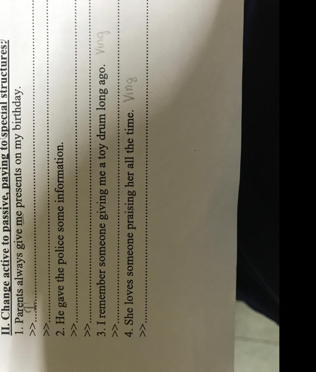 `-` Gerund: S + V (theo thì) + being + P2 + (by O)