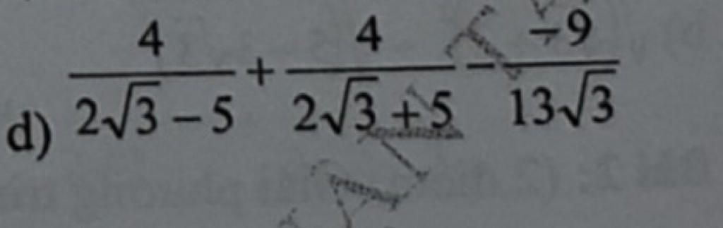 `= (4(2\sqrt{3}+5))/((2\sqrt{3}-5)(2\sqrt{3}+5)) +(4(2\sqrt{3}-5))/((2\sqrt{3}-5)(2\sqrt{3}+5))+(9\sqrt{3})/(13\sqrt{3}.\sqrt{3})`