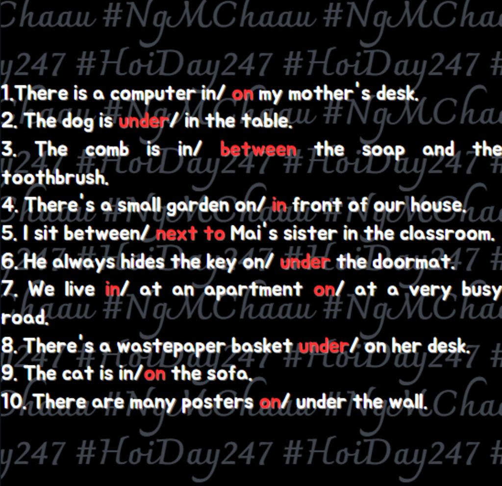 $On$ : Khi muốn diễn tả vật gì nằm trên cái gì đó (trên bề mặt), ta có thể sử dụng giới từ on.