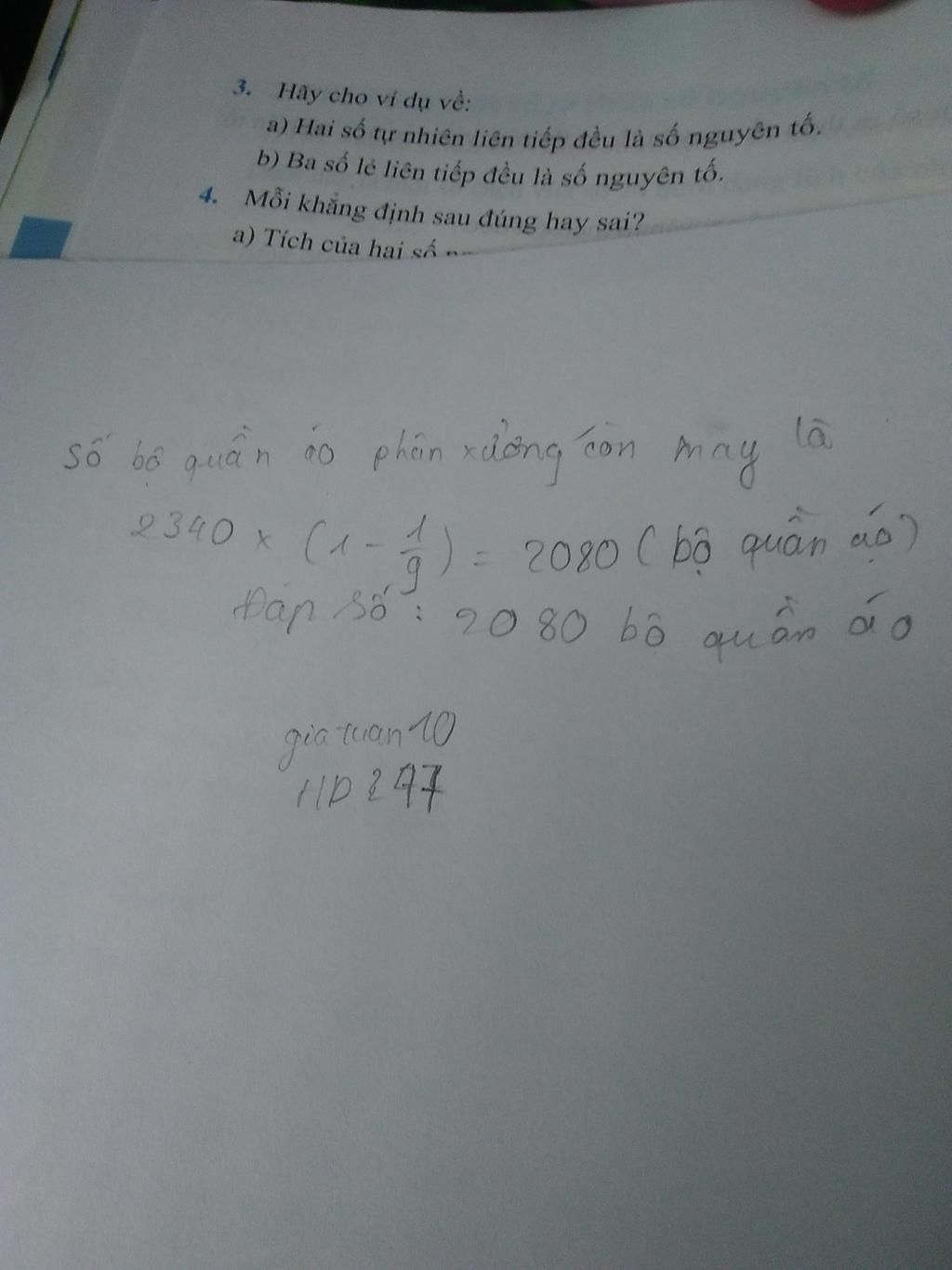 Một phân xưởng phải máy 2340 bộ quần áo. Phân xưởng đã mấy 1/9 số bộ quần áo đó .hỏi phân xưởng còn phải may bao nhiêu bộ quần áo nữa?