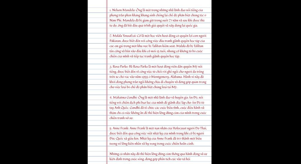 `-` Cô gái tên Malala Yousafzai người Pakistan, cô với sự dũng cảm, bất chấp khó khăn đứng lên đòi lại quyền đi học cho các bé gái (khi đó tại đất nước này đang cấm nữ giới đến trường. Cô với câu nói trong một bài phát biểu nhận giải Nobel đã gây nhiều ấn tượng với khán giả: "Bất kể con người ta mang màu da gì, hay nói tiếng gì và theo tôn giáo gì, chúng ta nên coi nhau là những con người và tôn trọng lẫn nhau, đấu tranh vì quyền của chúng ta, vì quyền của trẻ em, quyền của phụ nữ và quyền của tất cả mọi người trên thế giới."
