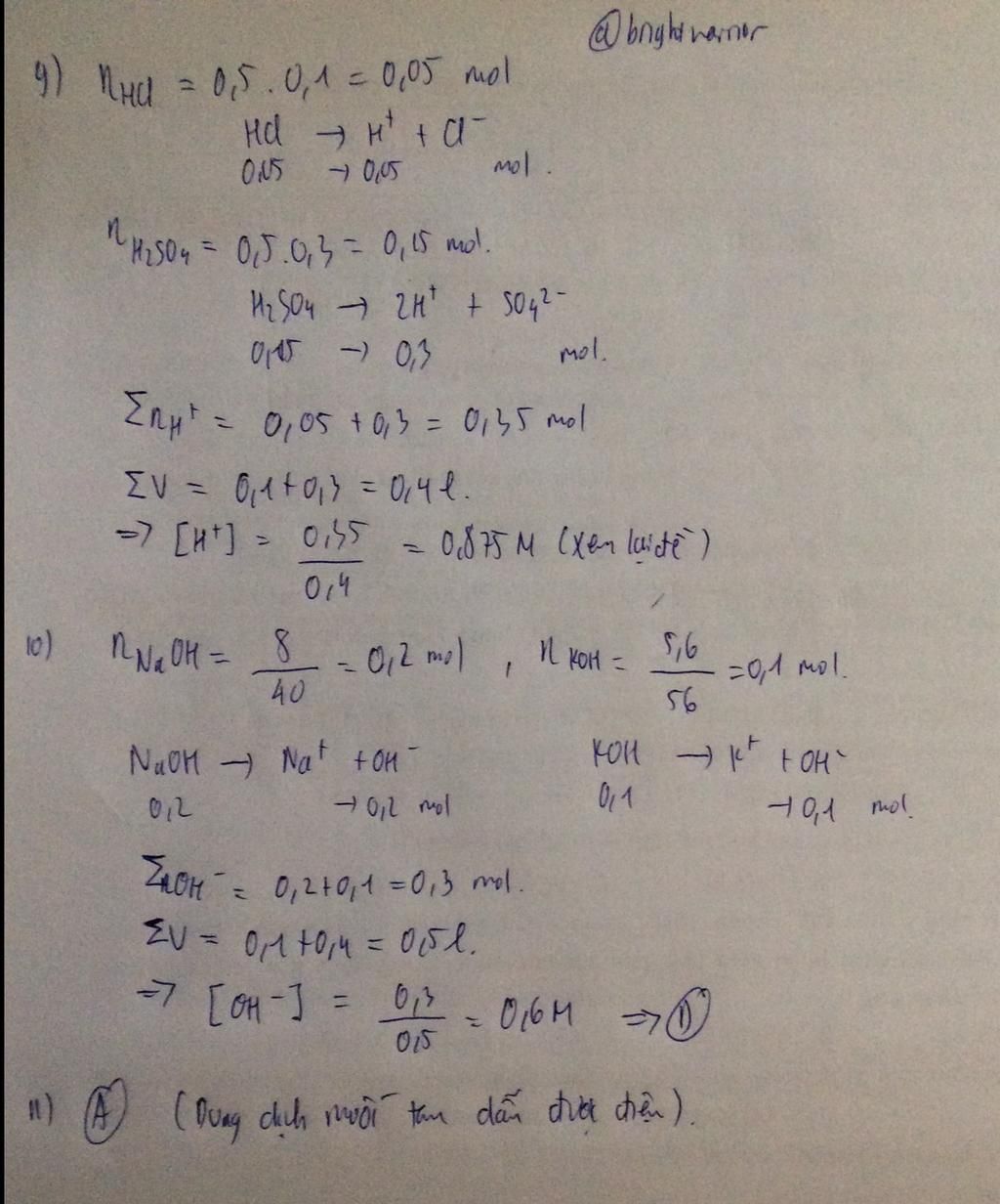 Câu 9: Trộn 100mL dung dịch HC1 0,5M với 300mL dung dịch H2SO4 0,5M thu được dung dịch X. Nồng độ mol/L của ion H+ trong dung dịch X là