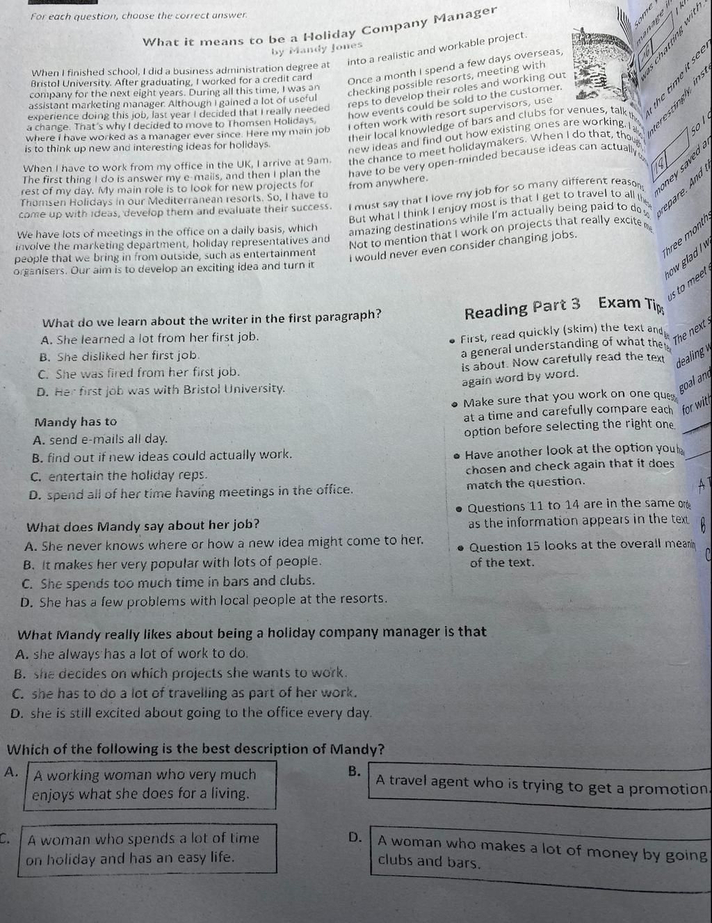 `-` Dẫn chứng: I often work with resort supervisors, use their local knowledge of bars and clubs for venues, talk through new ideas and find out how existing ones are working.