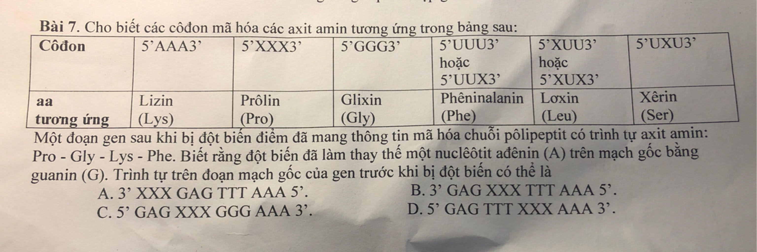 Bài 7. Cho biết các côđon mã hóa các axit amin tương ứng trong bảng sau: