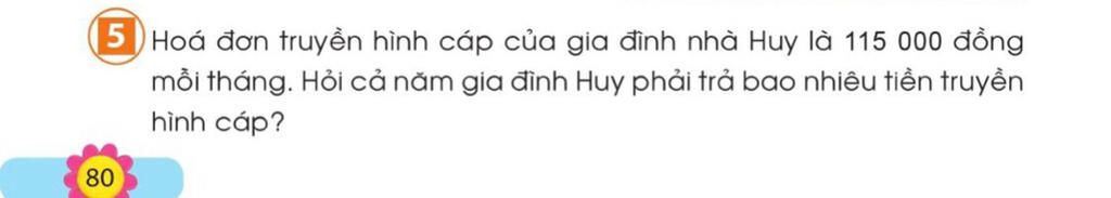Hoá đơn truyền hình cáp của gia đình nhà Huy Là 115000 đồng mỗi tháng.Hỏi cả năm gia đình Huy phải trả bao nhiêu tiền tuyền hình cáp ?