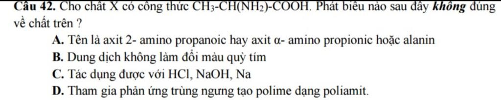 B.Đúng. X có 1 nhóm `NH_2` và 1 nhóm `COOH` nên k làm đổi màu quỳ tím