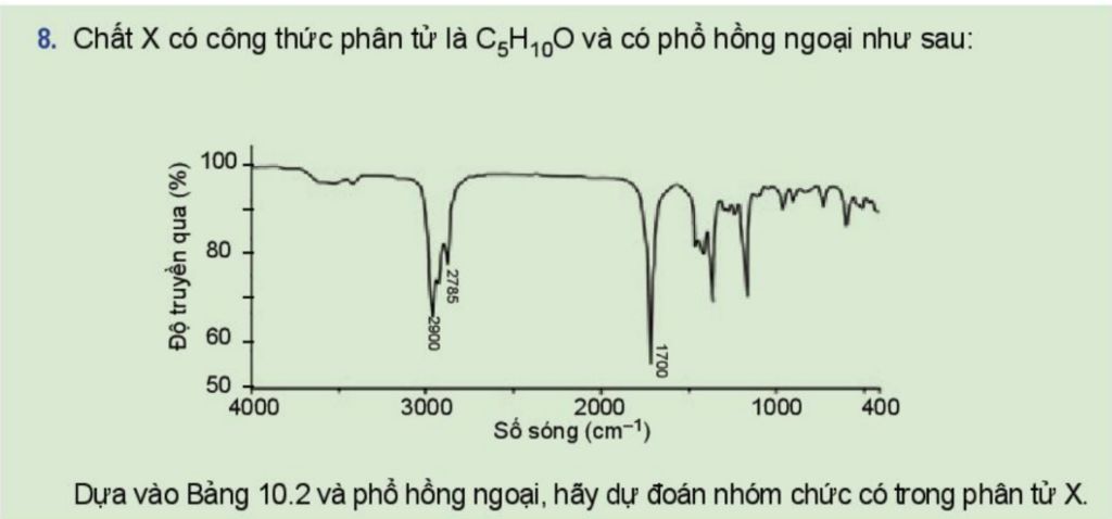 Phân tử $X$ có đỉnh hấp thụ ở số sóng $1700 cm^{-1}$, đây là số sóng tương ứng với nhóm carbonyl trong nhóm chức aldehyde. Do đó $X$ có nhóm aldehyde $CHO$.